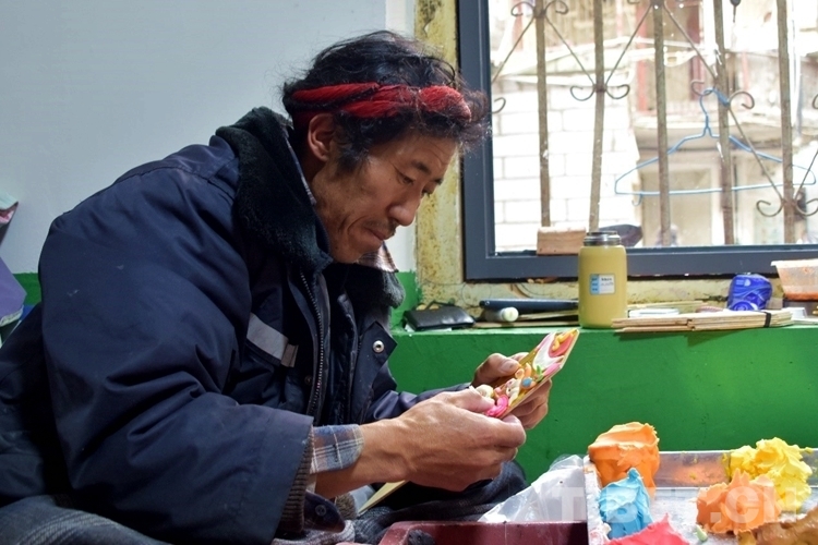 “我們一般在藏歷新年前20天左右到達拉薩。買酥油,和礦物染色原料調至成泥狀后便開始捏制。”旦增說,普松鄉有制作酥油花的傳統,每年藏歷新年臨近,他們便結伴來到拉薩制作酥油花銷售。