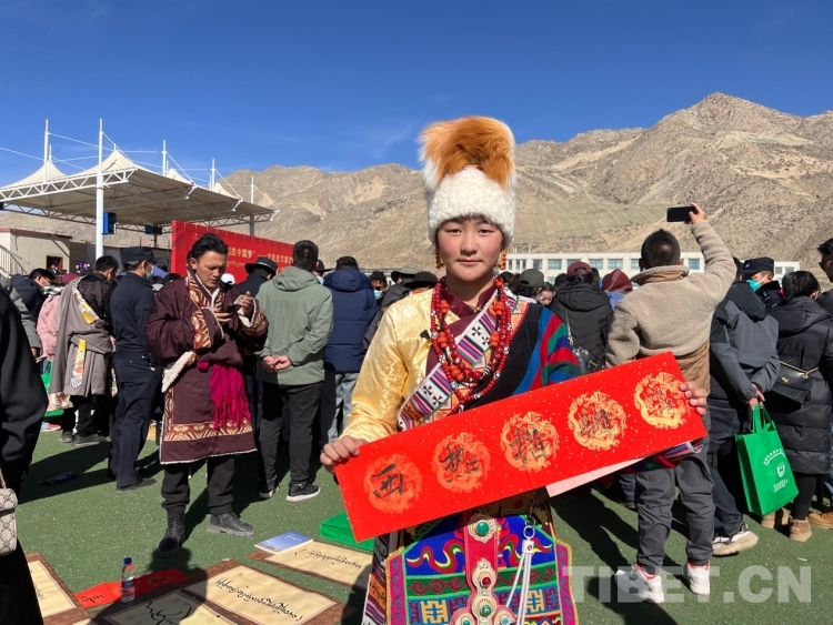 中國西藏網(wǎng)訊 2月16日,西藏自治區(qū)文聯(lián)主辦的“我們的中國夢”——文化進萬家活動在極高海拔生態(tài)搬遷安置點開展。在送“書法”現(xiàn)場,由西藏書法協(xié)會和山南市11位書法家為當(dāng)?shù)厝罕娝腿?00多張寓意美好的新年祝福和群眾期望的新年祝愿等。活動現(xiàn)場群眾絡(luò)繹不絕,大家心滿意足地拿著書法家為自己贈送的精美“禮品”。一旁書法家們忙碌地為群眾書寫祝詞,另一旁群眾們晾曬著他們得到的書法作品,一時間現(xiàn)場成了“書法展”,時不時地有人前來參觀欣賞。(中國西藏網(wǎng) 記者/德吉卓瑪)