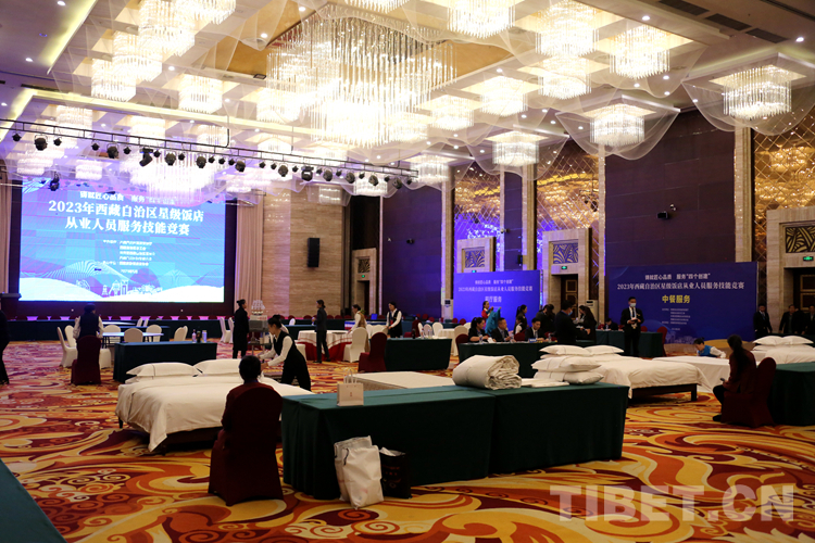 中國西藏網訊 5月11日,由西藏自治區旅游發展廳、西藏自治區總工會、共青團西藏自治區委員會、西藏自治區婦女聯合會主辦,西藏旅游飯店業協會承辦的2023年西藏自治區星級飯店從業人員服務技能競賽在拉薩開賽。45名選手圍繞中餐宴會擺臺、西餐宴會擺臺、中式鋪床及夜床服務、前廳服務4個項目同臺競技。