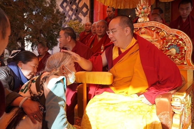 10時許,法號陣陣,班禪在僧眾的簇擁下來到扎什南捷靈塔殿前,面帶微笑登上寶座盤腿坐定,數(shù)位僧人恭立兩旁,齊聲誦讀祈禱祝福經(jīng)文,手捧哈達的信教群眾脫帽、躬身、俯首,滿懷虔敬依次來到寶座前,班禪笑容慈和地一一為他們摸頂賜福。