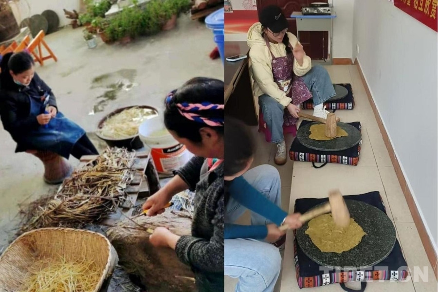 關于藏紙的起源,學術界更偏向《舊唐書·吐蕃》中的記載:唐高宗時期,吐蕃贊普葉宗弄贊(注:松贊干布)“因請蠶種及造酒、碾、磑、紙、墨之匠”,隨文成公主入藏。自此,西藏關于紙的技藝因地而成,代代相傳。1300多年后的一個清晨,在金東鄉的工坊內,記者見到了金東藏紙制造技藝非遺傳承人加里,也看到了藏紙一大分支——金東藏紙中的古法脈搏。