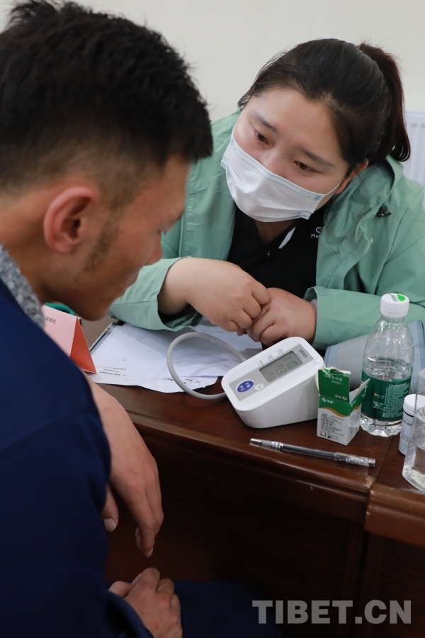 圖為義診現場,首都醫科大學附屬北京潞河醫院神經內科行政副主任童燕娜為指戰員測量血糖 攝影:楊月云