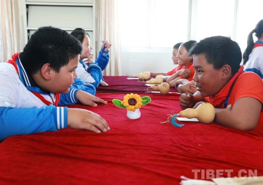 圖為山東聊城堂邑鎮中心小學學生向西藏阿里噶爾縣孔繁森小學的小伙伴贈送并介紹媽媽親手制作的向日葵小擺件 攝影:劉莉