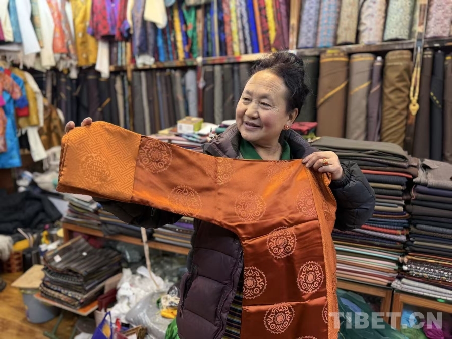 位于拉薩八廓古城區附近的羅布桑培服裝店內,前來選購藏裝的顧客絡繹不絕。店主色珍啦在此經營已有二十余年,從最初銷售農產品逐步轉型為專營藏裝。她表示,每逢新年來臨,店內客流量明顯增加,為滿足顧客需求,今年準備了更加豐富的面料、顏色和款式供選擇。