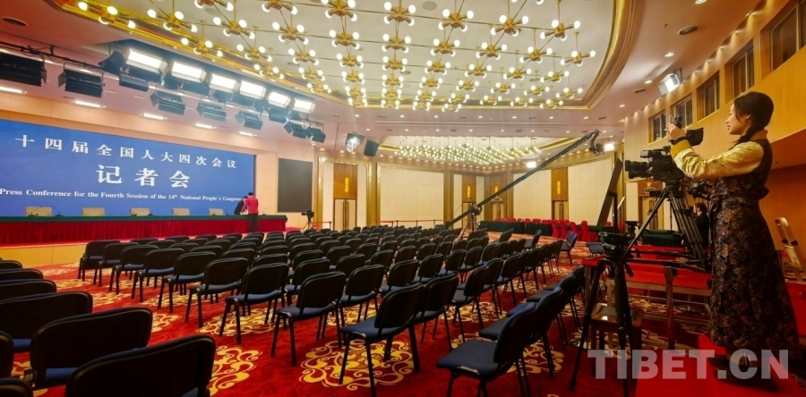 中國西藏網記者正在拍攝2026年全國兩會新聞中心工作人員布置新聞發布廳 攝影:劉莉