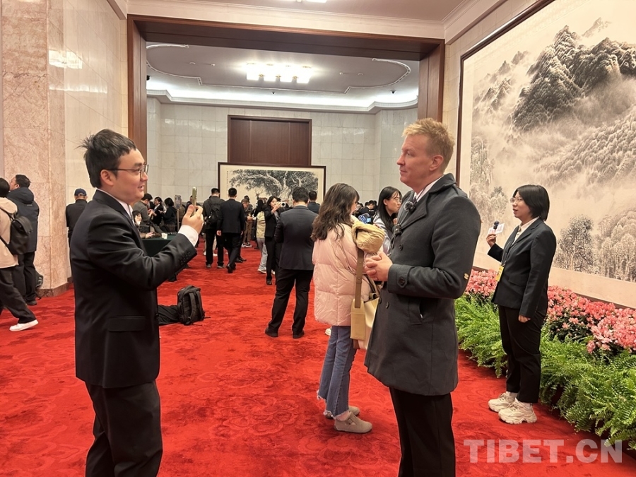 中國西藏網記者采訪美籍記者聶子瑞,這是他第九次參加全國兩會報道 攝影:邊子捷