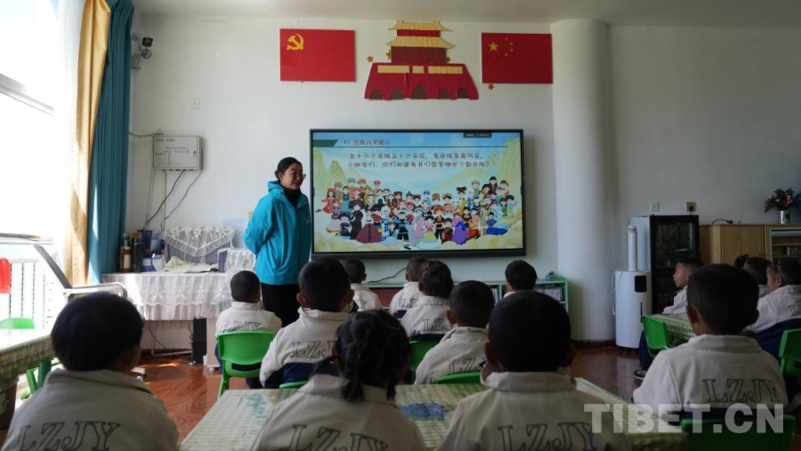 在西藏日喀則市拉孜縣第二幼兒園(1)班教室里,老師郁瓊珠姆話音剛落,孩子們的回答便齊聲響起,清脆而堅定。屏幕上,56個民族的卡通形象匯聚于一幅畫之中。她接著問道:“那我們國家遼闊的土地上,生活著多少個民族?”一只只小手高高舉起,搶答聲此起彼伏:“56個!”對孩子們而言,這些答案已經成為日常學習生活中耳濡目染的常識。
