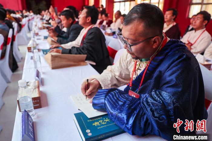 圖為唐卡畫師認真記錄交流會內容。中新社記者 薛蒂 攝