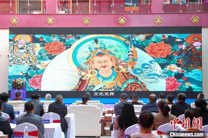 圖為交流會播放熱貢藝術宣傳片。中新社記者 薛蒂 攝