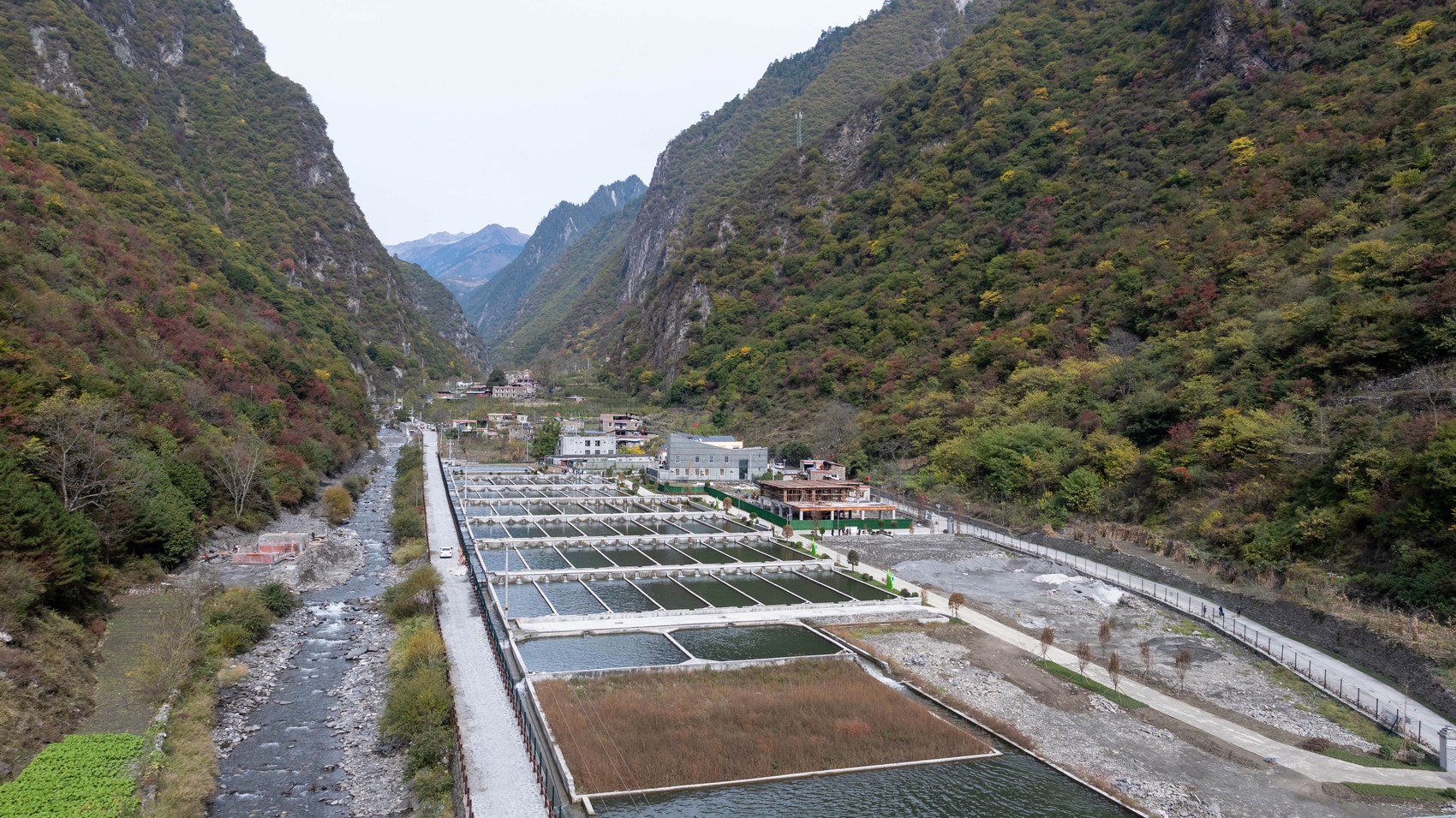50個長方形養殖池依次排列,清澈的冷泉水在其中潺潺流動,不時有魚兒躍出水面。11月7日一早,“萬千氣象看四川”四季度集中采訪活動報道組來到理縣薛城鎮甲米村,在海拔2000米的地方,見到了初具規模的高原特色冷水魚產業基地,這也是阿壩州第一家規模化冷水魚養殖基地。