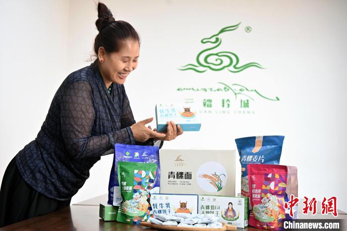 圖為“青稞姐姐”尕旦木草展示公司所研發的青稞產品。九美旦增 攝