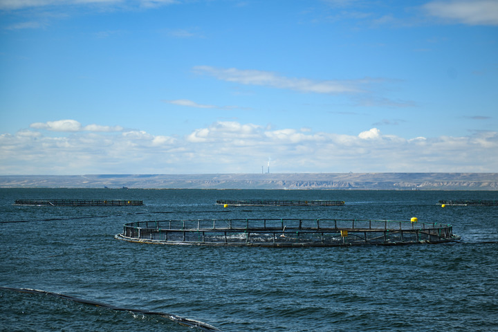 從空中俯瞰,龍羊峽水庫平湖區(qū)的水面上,數(shù)個(gè)大大的圓圈整齊排開,這些都是三文魚的養(yǎng)殖網(wǎng)箱。養(yǎng)殖網(wǎng)箱里,不時(shí)有魚兒躍起。順著管道,一條條三文魚隨著水流被吸魚泵直接從養(yǎng)殖網(wǎng)箱吸入操作車間。