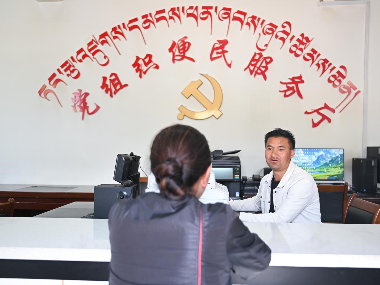 4月13日,在才堂村黨組織便民服務廳,工作人員正在為村民講解醫療保障政策。新華社記者 張龍 攝