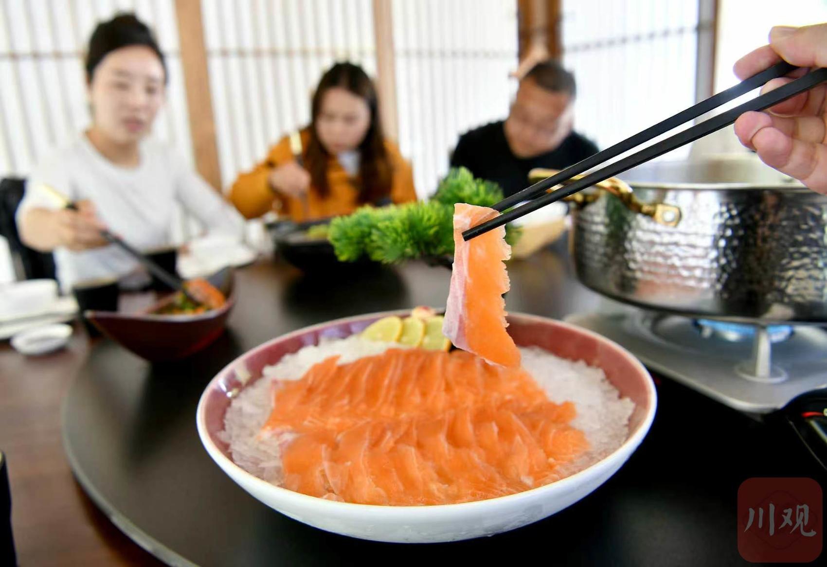 養(yǎng)殖基地現(xiàn)撈現(xiàn)切的三文魚片。華小峰 攝