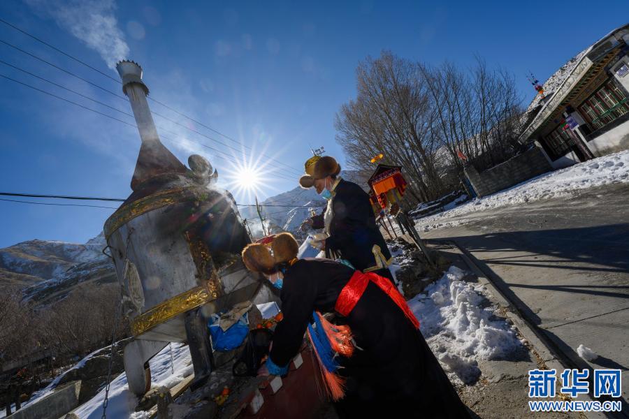 2月12日,在西藏自治區山南市乃東區澤當鎮,格央和父母一起,在藏歷新年第一天轉山祈福。這是格央(前)和父親一起煨桑。新華社記者 劉金海 攝