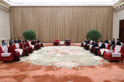四月二十五日,河南省委書記樓陽生、省長王凱在鄭州會見班禪額爾德尼·確吉杰布一行。 記者 董亮 攝