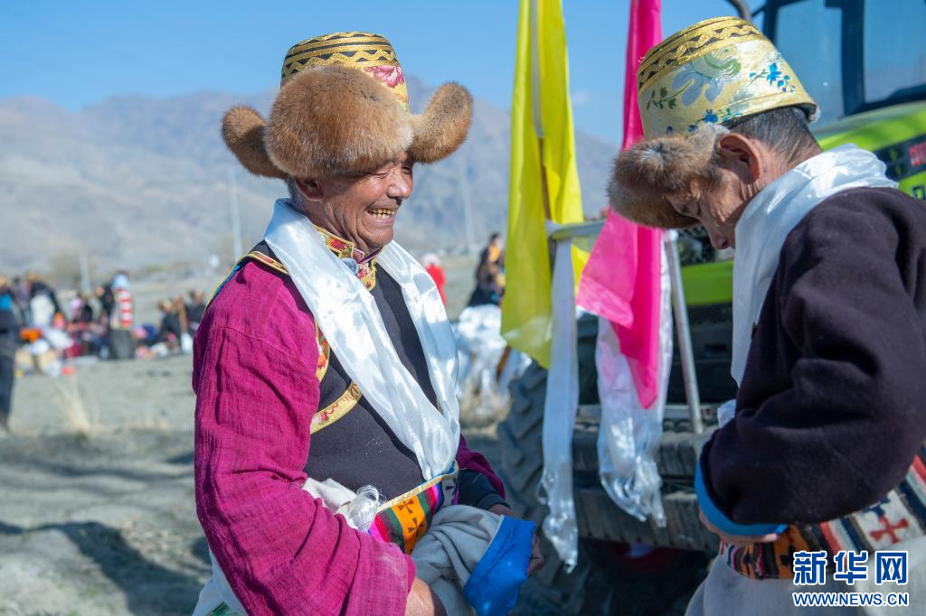 3月16日,克松社區居民格桑多吉(左)在參加春耕儀式。新華網 旦增努布 攝
