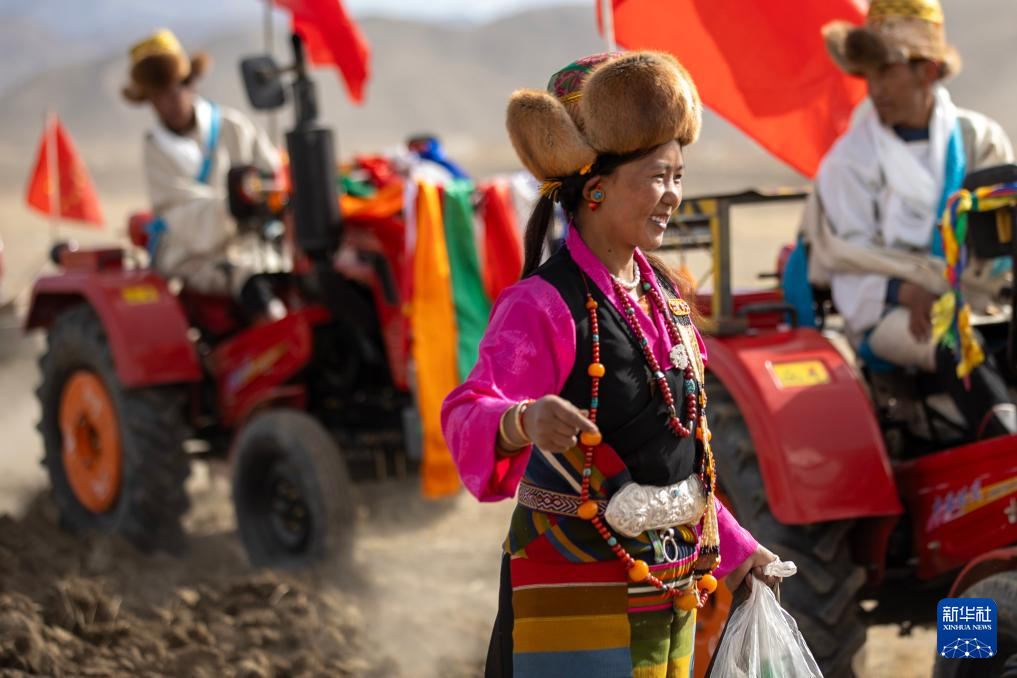 儀式現場,38臺農用拖拉機整齊停放。11時許,在眾人的祈福聲中,清一色身著白色氆氌藏裝、頭戴長壽金絲帽的拖拉機手把拖拉機開進農田,機身后掛的銀色犁頭刨開沉睡了一整個寒冬的沃土,盛裝的婦女們緊隨拖拉機,播撒希望的種子。