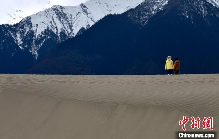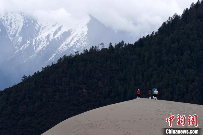 4月4日,游客在西藏米林市丹娘佛掌沙丘景點觀景。當日是清明假期第一天,眾多游客在該地游玩,樂享美好春光。丹娘佛掌沙丘位于米林市丹娘鄉,因沙丘倒影在雅魯藏布江中形成雙手合十的形狀,故被譽為佛掌沙丘。中新社記者 李林 攝