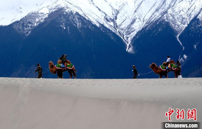 4月4日,游客在西藏米林市丹娘佛掌沙丘景點體驗騎駱駝。當日是清明假期第一天,眾多游客在該地游玩,樂享美好春光。丹娘佛掌沙丘位于米林市丹娘鄉,因沙丘倒影在雅魯藏布江中形成雙手合十的形狀,故被譽為佛掌沙丘。中新社記者 李林 攝