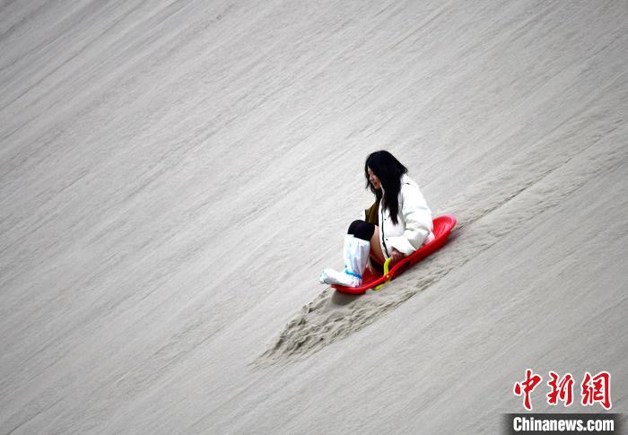 4月4日,游客在西藏米林市丹娘佛掌沙丘景點體驗滑沙。當日是清明假期第一天,眾多游客在該地游玩,樂享美好春光。丹娘佛掌沙丘位于米林市丹娘鄉,因沙丘倒影在雅魯藏布江中形成雙手合十的形狀,故被譽為佛掌沙丘。中新社記者 李林 攝