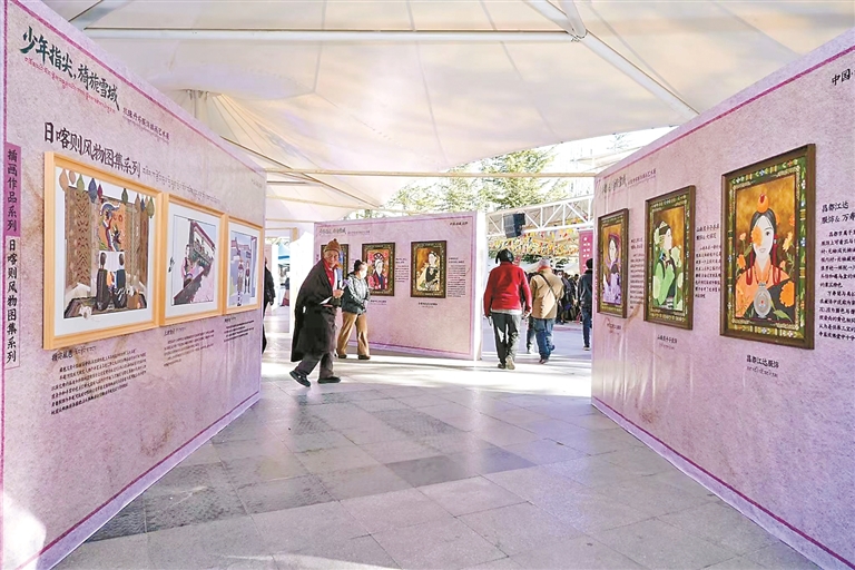 圖為市民游客在宗角祿康公園駐足觀賞“旖旎雪域”主題班珠丹塔服飾作品與插畫藝術(shù)展。