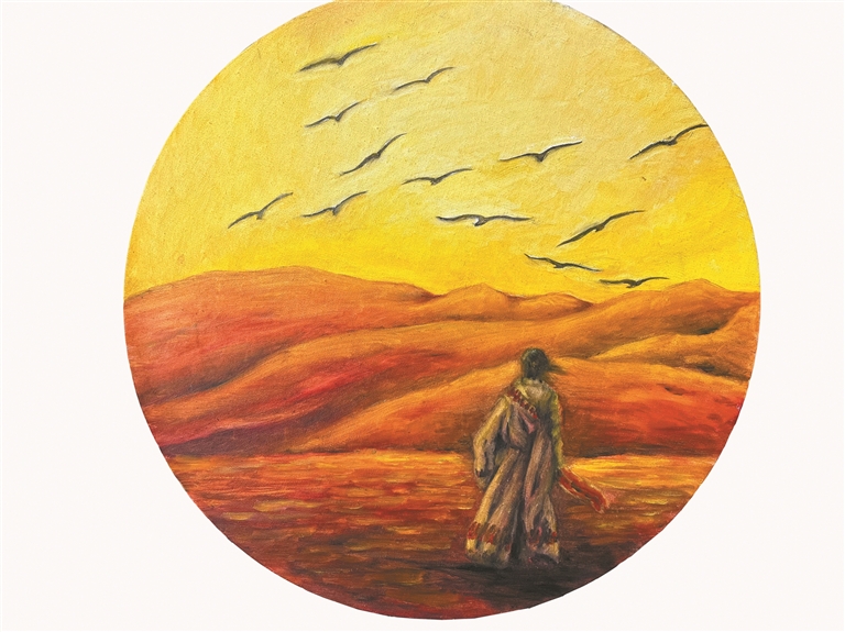 這種融合,在她的作品中綻放出獨特的光彩。她的作品《在路上》在第二屆“和美西藏”美術作品大賽上獲優秀作品獎。這幅作品描繪了曲水縣俊巴村漁民勞作的日常詩篇,畫面上,夕陽將雅魯藏布江染成金紅色,一位漁民背著輕巧的牛皮船,踏著蜿蜒的村道歸家。他的身軀因負重而微微前傾,腳步卻輕快有力,嘴里似乎還哼唱著漁歌,整個畫面流淌著收獲的滿足與歸家的愉悅。