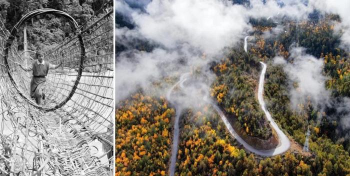 拼版照片:左圖是墨脫縣雅魯藏布江上的藤橋(20世紀80年代資料照片,新華社記者 顧綬康 攝);右圖是2020年11月5日拍攝的派墨公路米林段公路。新華社發