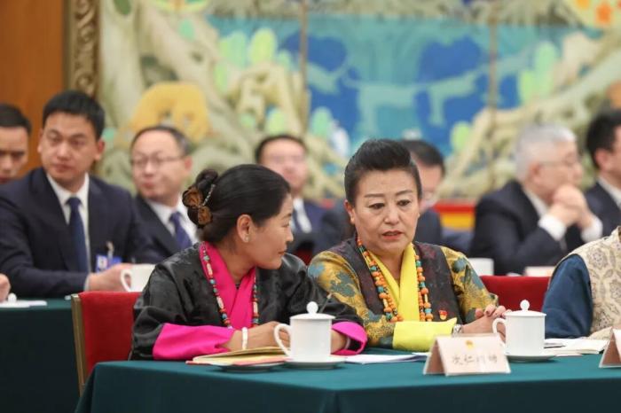 3月6日,十四屆全國人大四次會議西藏代表團舉行開放團組會議。圖為會前,全國人大代表次仁措姆(左)和格桑卓瑪交流。