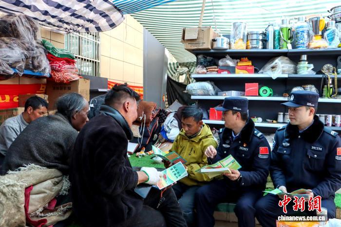 圖為里孜邊檢站民警走進商鋪介紹國家安全教育相關法律知識。劉海東 攝