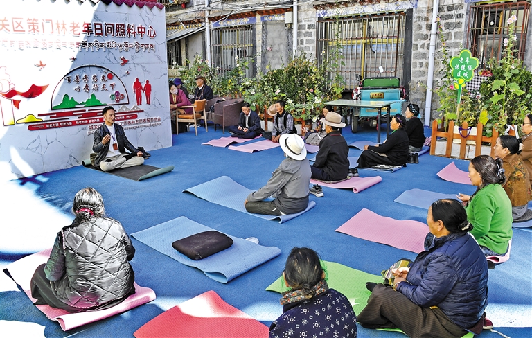 圖為拉薩市城關區策門林老年日間照料中心舉辦培訓,教老人們練習瑜伽。記者 旦增蘭澤 攝