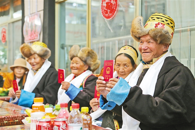 圖為山南市瓊結縣特困人員集中供養服務中心的“新人”阿南高興地展示自己的結婚證。記者 白瑪澤旺 通訊員 倫珠澤旺 攝