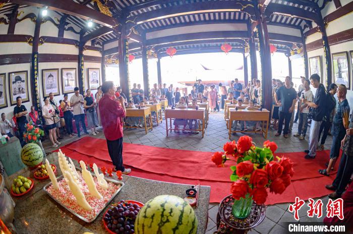 8月4日,在福建省三明市沙縣區鄧光布將軍祠,十幾名即將上一年級的孩子在長輩的注視下,行拜師禮、開筆破蒙、齊誦經典,用沙縣獨有的蒙學式為即將到來的學習生活留下難忘紀念。