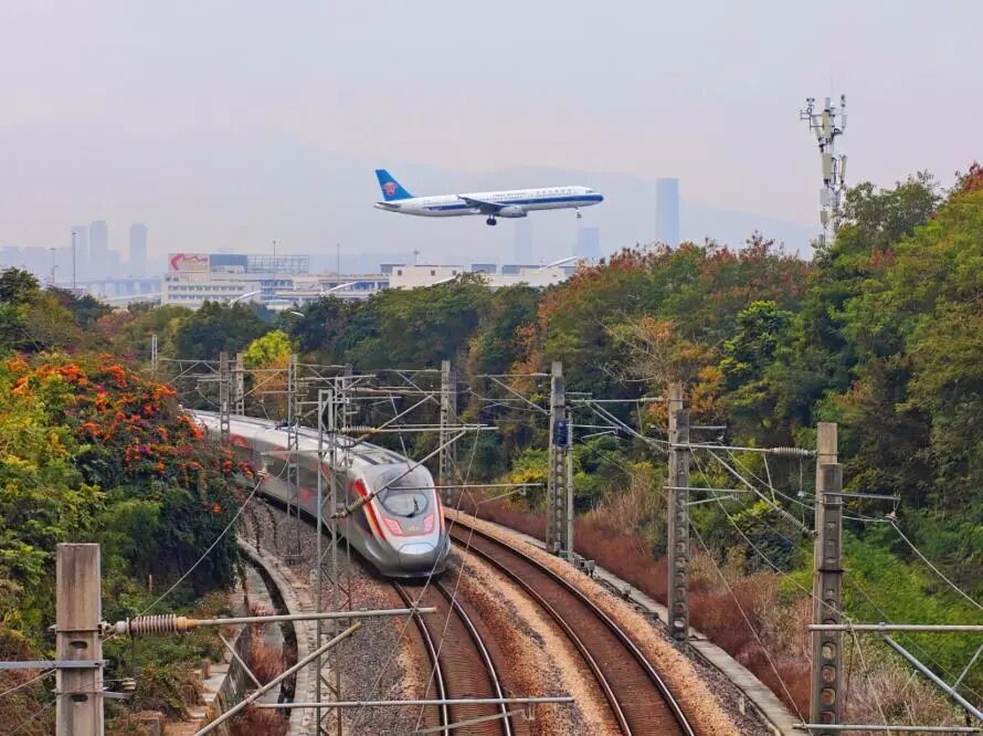 廈門島內鷹廈線路上,紅色復興號與藍色飛機同框。