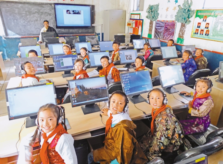 圖為西藏自治區日喀則市南木林縣完全小學的學生在上計算機課 攝影:楚武干