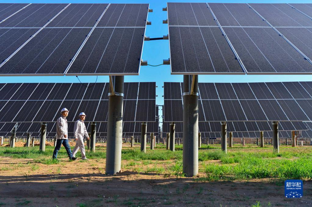 工作人員在內(nèi)蒙古自治區(qū)鄂爾多斯市伊金霍洛旗天驕綠能50萬千瓦采煤沉陷區(qū)生態(tài)治理光伏發(fā)電示范項(xiàng)目區(qū)里巡查(2021年7月8日攝)。 新華社發(fā)(王正 攝)