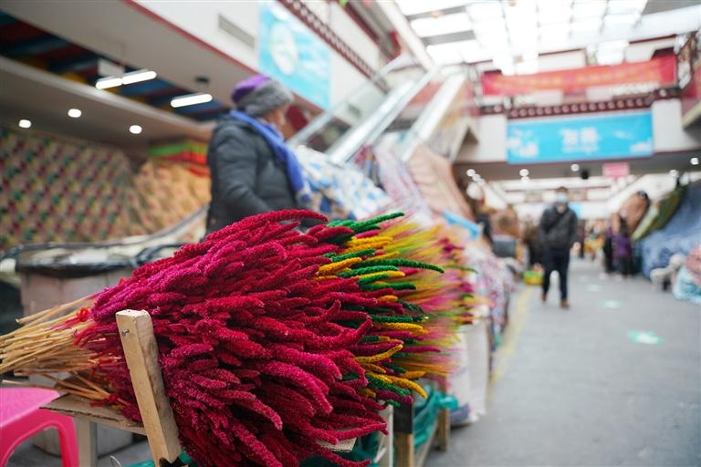 “買1束羅薩梅朵吧。1束5支,這些包好的統統只要4塊錢!”來自拉薩市堆龍德慶區桑木二村的老板白扎身前攤位上擺滿了艷麗多彩的羅薩梅朵,他向來往的人群大聲吆喝著。趁著交易間隙白扎向記者介紹:“我們村家家戶戶都是制作羅薩梅朵的好手,你看我攤位上的這些,全是自己家里制作的,我賣羅薩梅朵已經5年了,每年都能賣1萬多塊。賺到的錢,準備給家人買新衣服,一起過個好年。”