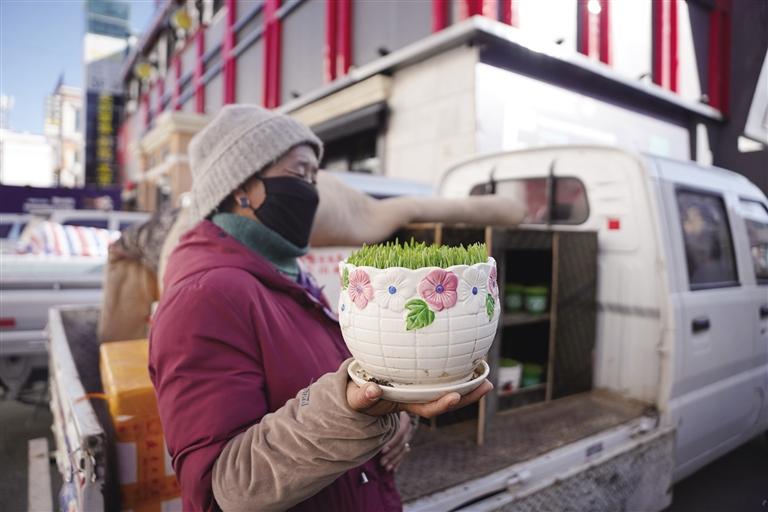 每年藏歷新年,家家戶戶都會在家里擺放青稞苗,寓意豐收吉祥。另一旁的攤位上記者看到,掛著水滴的青稞苗在溫暖的陽光照射下,顯得格外好看。