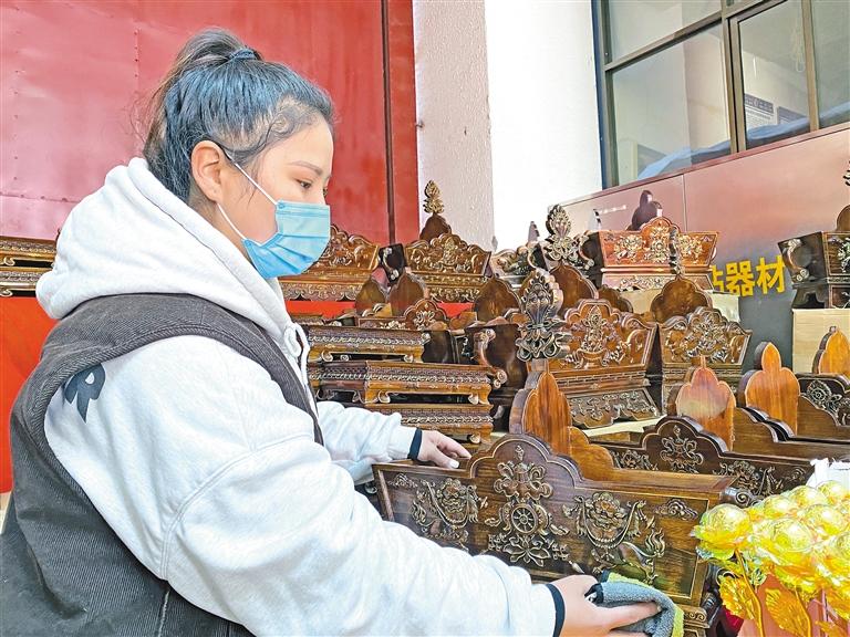 來自山南市貢嘎縣的拉吉帶著自家生產(chǎn)的“切瑪盒”第2次來到八廓商城年貨市場。“由于是自家生產(chǎn),所以我們自主設(shè)計了一款線條稍微簡約的‘切瑪盒’;還有一款傳統(tǒng)線條與圖案的‘切瑪盒’。在顏色上,我們選擇了較為持重的深色,這樣的顏色大氣沉穩(wěn),許多市民非常喜歡,兩款售價都是380元。”拉吉介紹道。