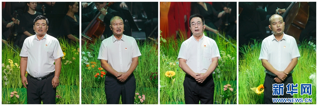 7月17日晚上,來自基層的村干部鞏保雄(左一)、高泉偉(左二)、俞小平(右二)和施金通(右一)走上舞臺,深情講述《新時代——我做鄉村振興答卷人》。新華網 肖和勇 攝