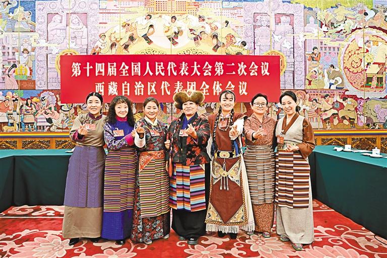 圖為西藏全國人大代表中的“七朵金花”在北京人民大會堂西藏廳合影留念,并祝福全區婦女同胞“三八”國際勞動婦女節快樂。
