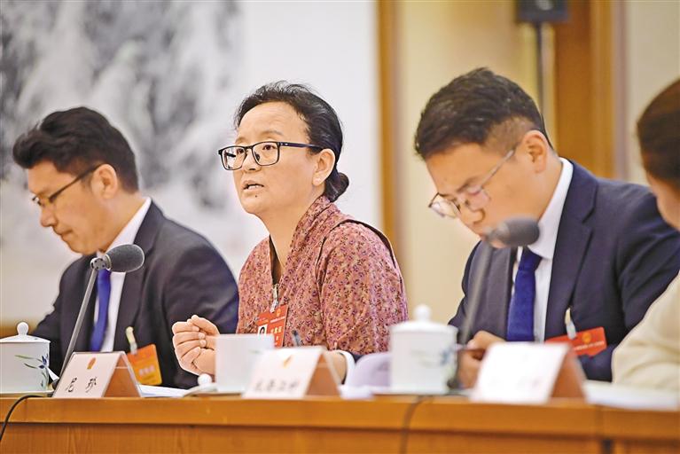 圖為3月7日,西藏代表團舉行全體會議,傳達學習習近平總書記在看望參加全國政協十四屆二次會議的民革、科技界、環境資源界委員并參加聯組會議時的重要講話,審議國務院組織法修訂草案,繼續審查計劃報告和草案、預算報告和草案。圖為尼珍代表在會上進行討論發言。記者 旦增西旦 攝