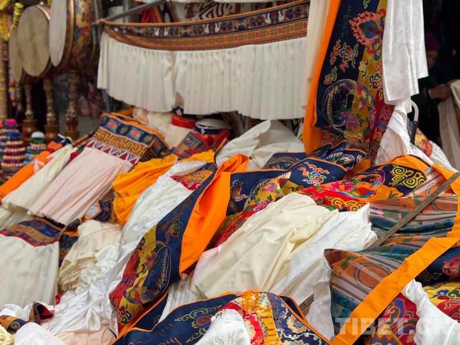 圖為香布,是懸掛于藏式建筑的門窗上部,通常用五彩綢布縫制而成,主體顏色為白色,再配上紅、藍、黃等顏色的邊沿。“香布”一年一換,祈求新意和吉祥,也標志著新年的到來。