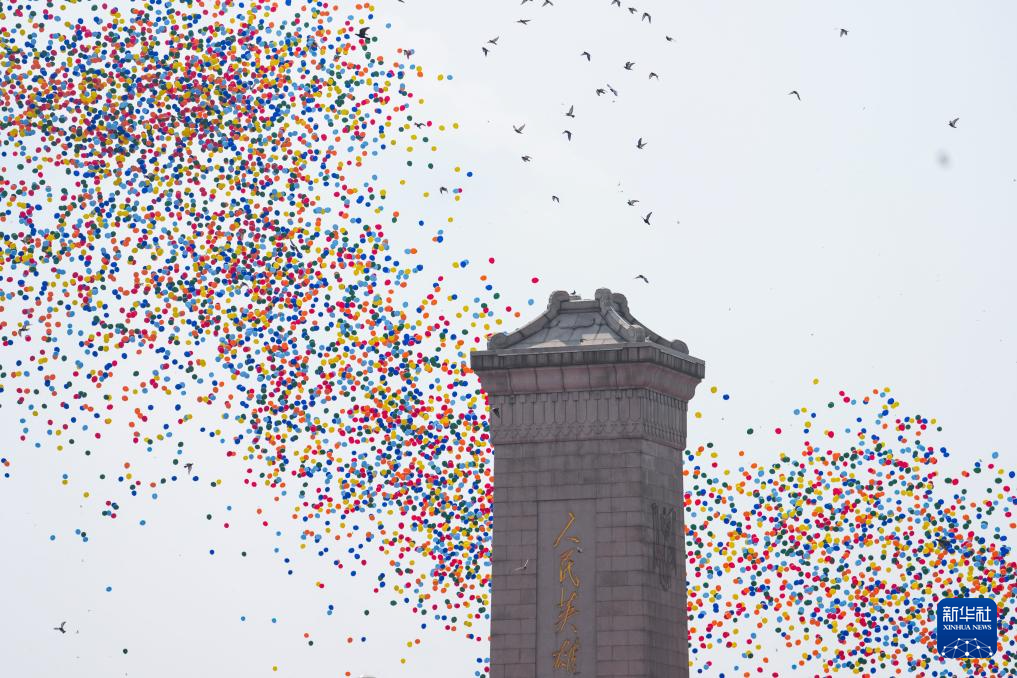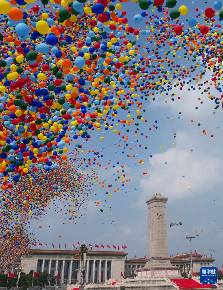 9月3日,紀念中國人民抗日戰爭暨世界反法西斯戰爭勝利80周年大會在北京隆重舉行。這是紀念大會現場放飛氣球。
