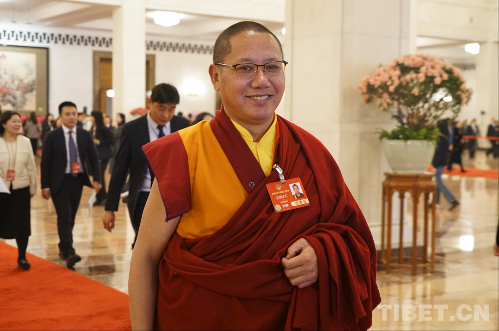 圖為全國政協委員達扎·尕讓托布旦拉西降措在人民大會堂前 攝影:楊眉笑