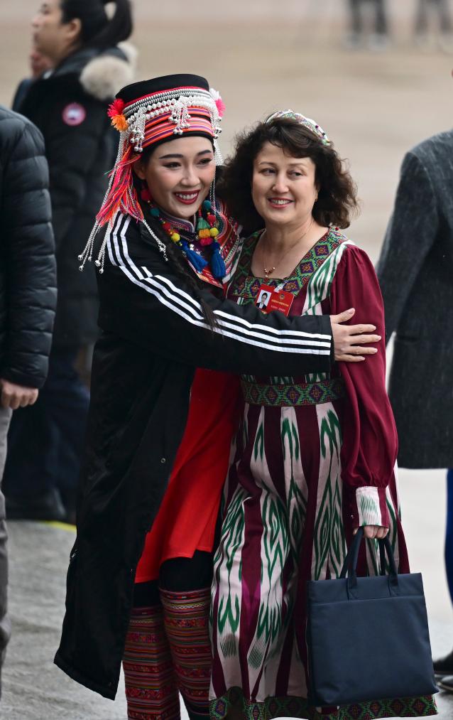 3月4日,中國人民政治協(xié)商會議第十四屆全國委員會第四次會議在北京人民大會堂開幕。這是楊鈺尼委員(左)與木合拜爾·阿布都爾委員一起步入會場。