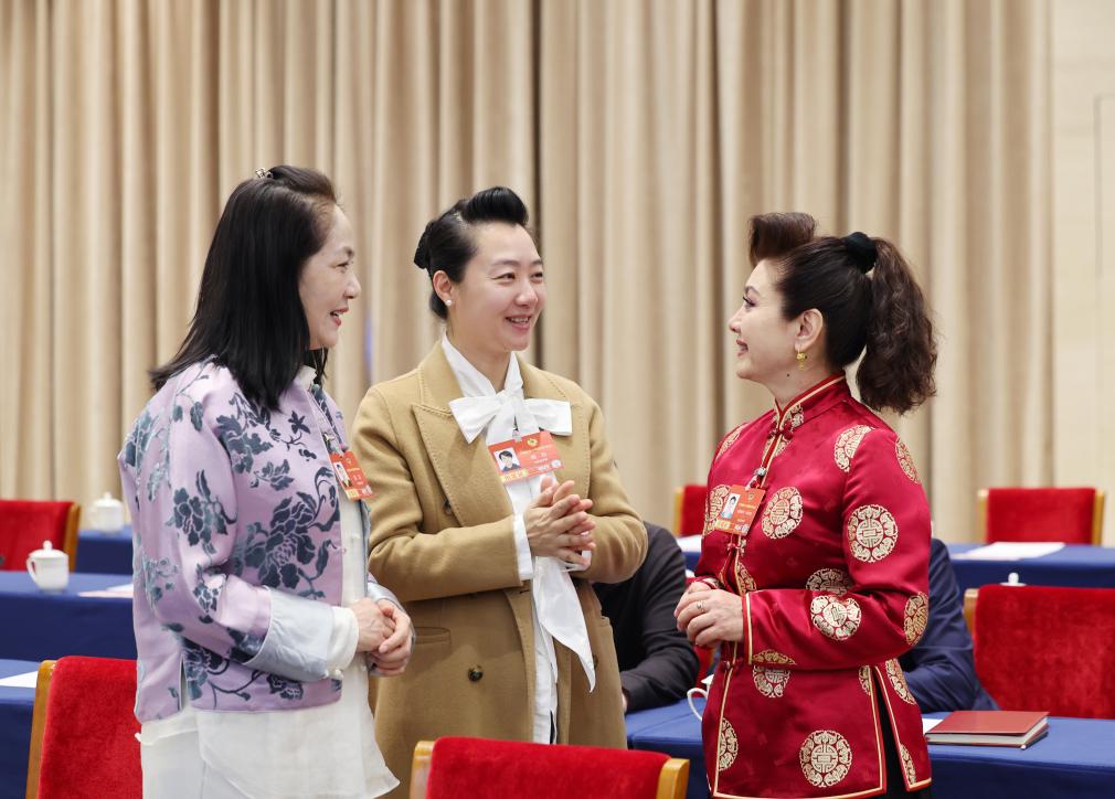 3月6日,全國政協(xié)委員迪麗娜爾·阿布拉(右)、周利(中)和苗潔在文化藝術(shù)、體育界委員聯(lián)組會前交流。新華社記者 姚大偉 攝
