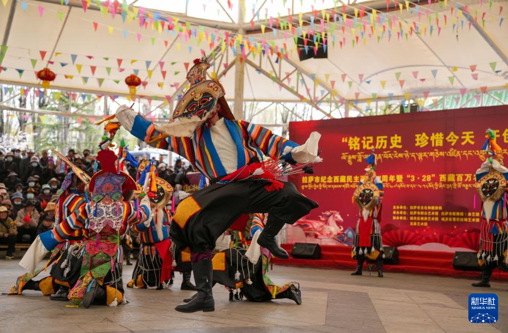 3月28日,演員在拉薩市宗角祿康公園內(nèi)舉辦的西藏百萬農(nóng)奴解放紀念日群眾演出活動上載歌載舞。新華社記者 丁增尼達 攝